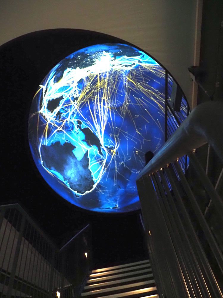 Am letzten Tag überraschte uns erneut die Umwandlung eines Industrie-Denkmals in ein kulturelles Highlight: der Gasometer in Oberhausen mit der Ausstellung „Das zerbrechliche Paradies“. Neben ausgezeichneten Fotografien und Videofilmen in den beiden unteren Ebenen, wird der 100 m hohe obere Teil von einer 20 m großen Erdkugel beherrscht, die wie im Weltall zu schweben scheint. Projektionen aktueller Satellitenbilder verstärken diesen Eindruck. Ursprünglich war für diesen Zeitpunkt ein Besuch der Villa Hügel geplant, die jedoch an diesem Tag nicht geöffnet war.