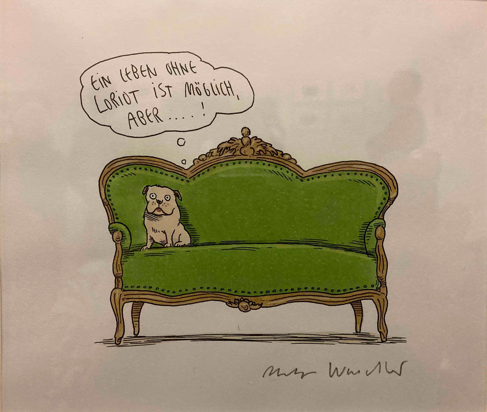 Um 15.00 Uhr stand Amüsantes von Loriot auf dem Programm. Neben dem erfreulichen Wiedererkennen seiner zahlreichen Zeichnungen, Bonmots und Fernsehsketche waren in der Ausstellung unbekannte private Werke von Vicco von Bülow zusehen, die seine Erben extra nur für diese Präsentation zusammengestellt hatten.
