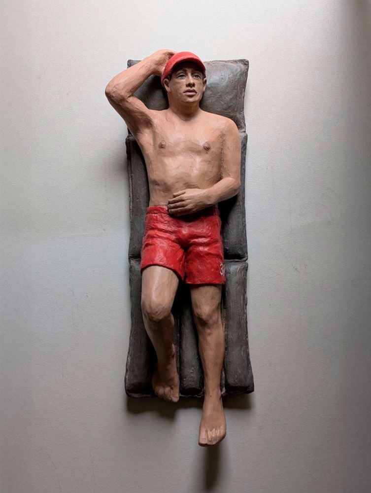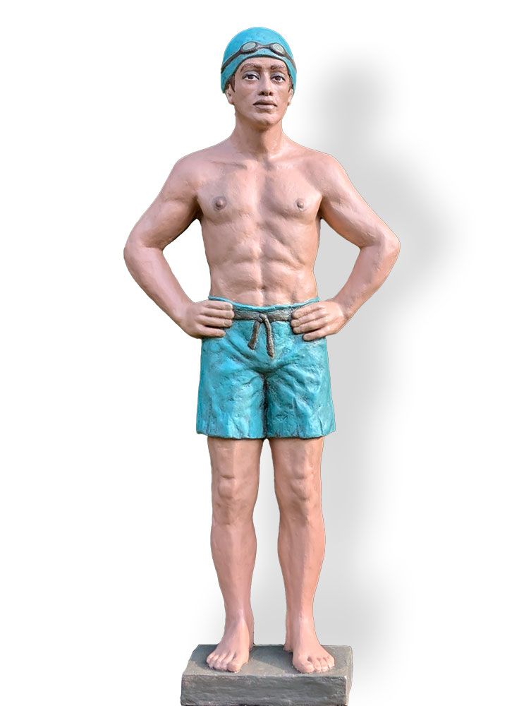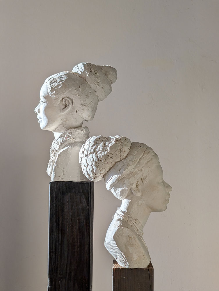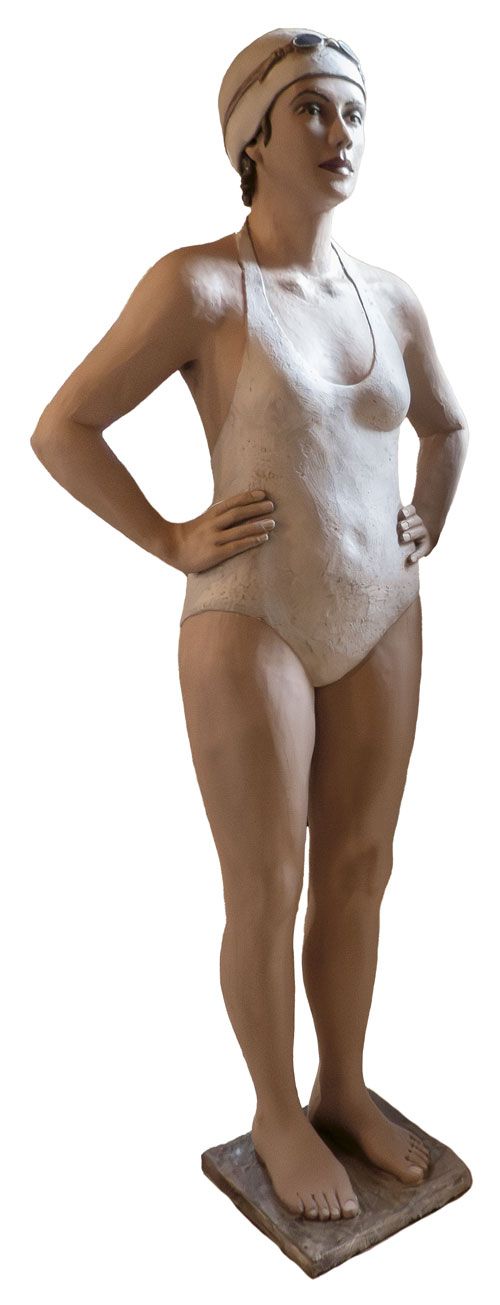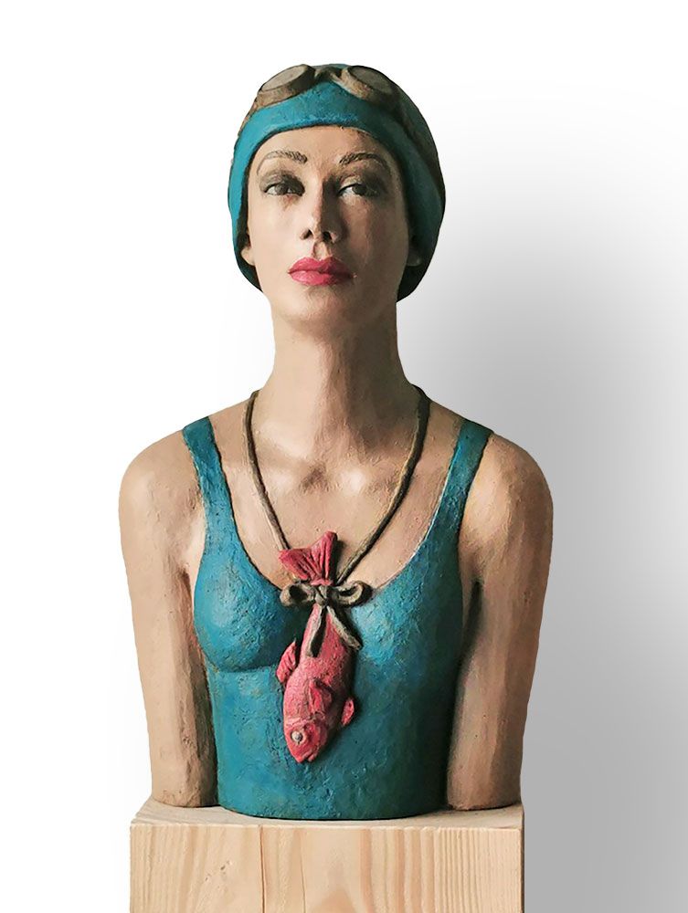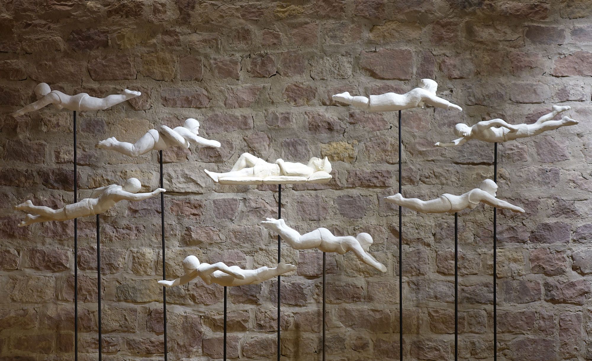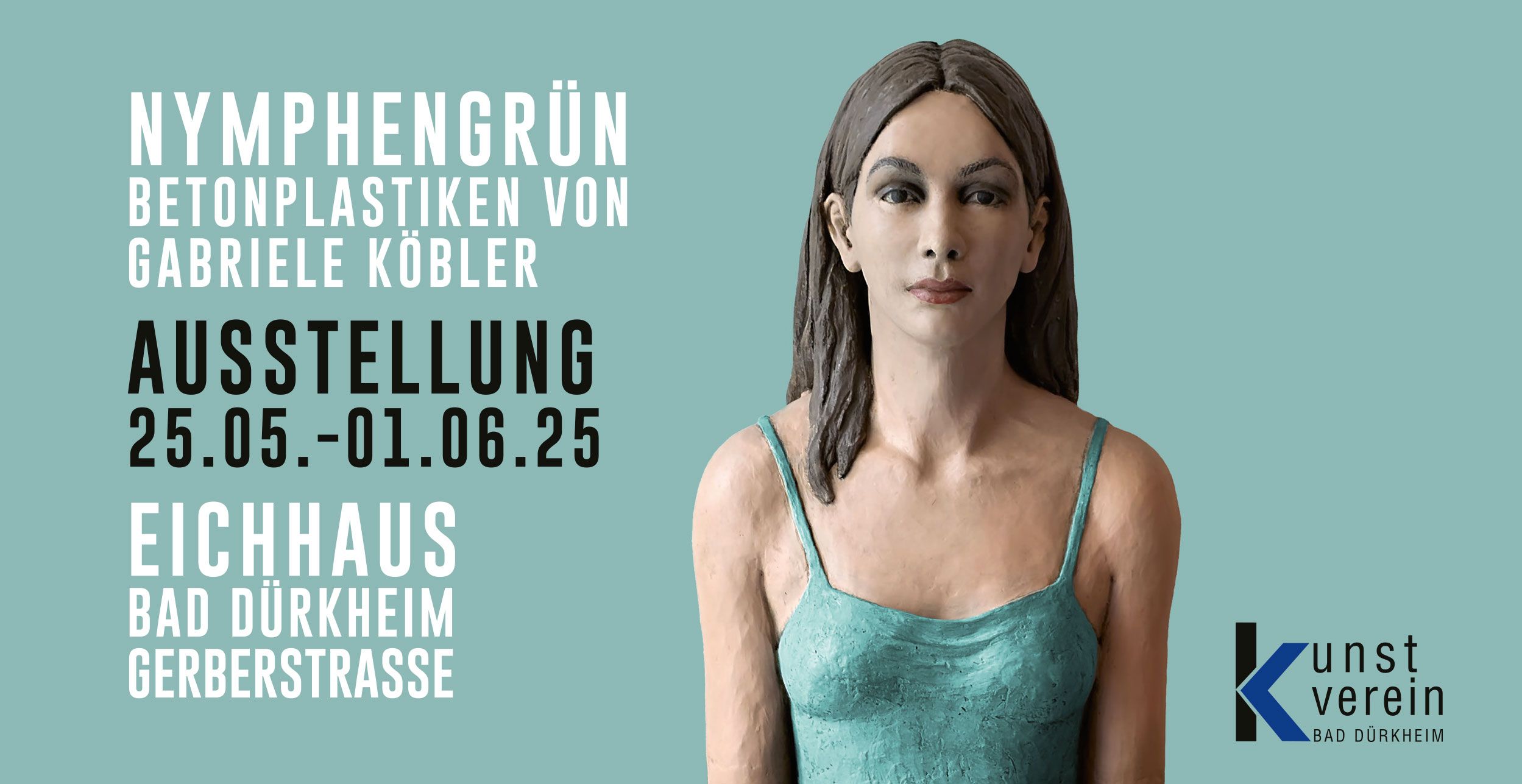 Dieser Lasurfarbe verdankt die Ausstellung NYMPHENGRÜN nicht nur ihren Namen, sie ist ihre Daseinsberechtigung. Was sich im Rückblick erklärt. 2014 entsteht im Eichhaus-Atelier des Dürkheimer Künstlers Karl Seiter (1949-2021) die Isenach-Nymphe, ein STADTKUNST-Geschenk des Kunstvereins an Bad Dürkheim. Zehn Jahre später wird die angeschlagene Nymphe dank Köblers Notfalleinsatz fachmännisch „geheilt“ und erhält auch ihre ursprüngliche grünspanige Farbe zurück. Was also lag näher, aus diesem freudigen Anlass die erstaunliche Verbindung Nymphe-Isenach-Eichhaus-Köbler auch öffentlich sichtbar zu machen? Die Ausstellungsidee NYMPHENGRÜN war geboren. Denn wie Karl Seiter vor ihr, so arbeitet auch die Freischaffende Künstlerin Köbler bevorzugt mit Feinbeton, auch bei ihr gibt es Objekte aus Gibs oder Beton. Köblers unverkennbare Handschrift und Farbenliebe zeigt sich dabei im Figurativem wie bei Abformungen, insbesondere aber bei der Kombination des Trägerstoffes Feinbeton mit spezifisch entwickelten Lasuren (siehe „Nymphengrün“), die oft das Darunterliegende durchschimmern lassen. Diese Verbindung zwischen Material und Farbe schafft letztlich Begegnungen besonderer Art: Farblich gefasste große und kleine Büsten stehen im Eichhaus noch kleineren weiblichen Porträtköpfen gegenüber, die scheinbar im Raum schwebende Badegesellschaft („Reger Schwimmverkehr“) teilt sich gerne die Aufmerksamkeit unter anderem mit einer lebensgroßen weißen Schwimmerin und einem nymphengrünen sitzenden Frauenakt. Doch zum „Schwimmbad mit Personal“ wird das Eichhaus trotz seiner Nähe zur Isenach damit aber nicht.