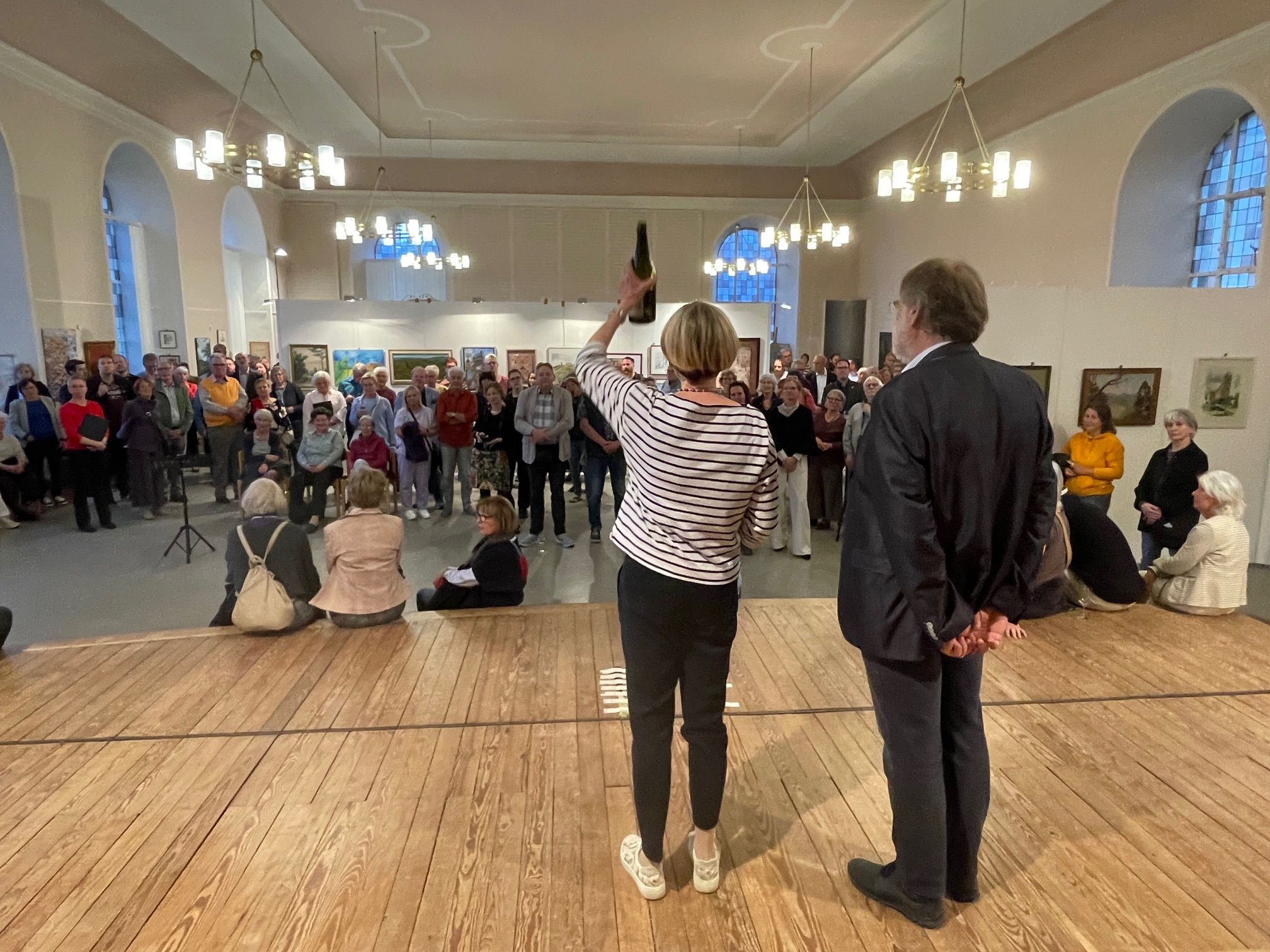 - Die verschiedenen Limburg-Darstellungen waren oftmals Anlass für interessante Gespräche: Anekdoten, künstlerische Statements, Hintergrundinformationen zu den vielfältigen inhaltlichen Aspekten der Ausstellung (Arbeiten der Studierenden, Arbeitsweise der Kunstaktiven, Jubiläumsetikett, Sammlung Höhn, Limburgmodell,Leihgaben), Diskussionen rund um die Limburg und ihre Bedeutung.