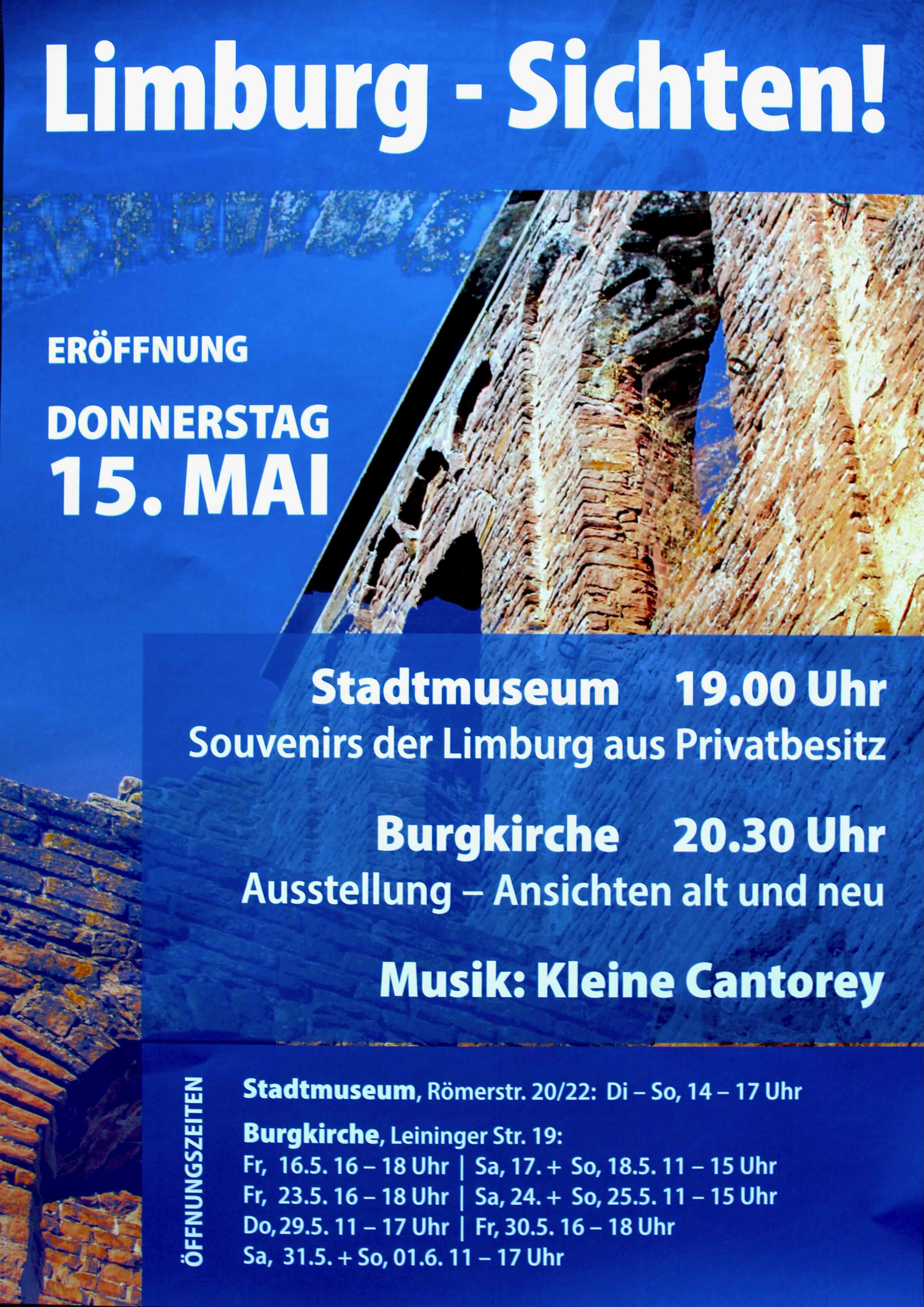 Auf der einen Seite sind Limburg-Ansichten gemeint, auf der anderen Seite sollen Exponate zur Limburg gesichtet werden, die in Teilen der Bevölkerung zur Limburg vorhanden sind. So wird das Stadtmuseum dreidimensionale Souvenirs um das Motiv der Ruine unter dem Titel „Limburg fer dehäm“ präsentieren, während in der Burgkirche Bilder in verschiedenen künstlerischen Techniken (Ölmalerei, Aquarell, Grafik, Zeichnung) aus Privatbesitz zur Limburg zu sehen sein werden. Zwischen diese, eher klassischen Ansichten, stellt die Aktivengruppe des Kunstvereins ihre heutigen Interpretationen und Bearbeitungen des Sujets aus. Die Bandbreite wird hier von den eher konventionellen Techniken über Fotografie und Collage bis hin zu Objekt-Kunst reichen. Zu allen Exponaten soll eine kleine Information zu dem jeweiligen Werk präsentiert werden.