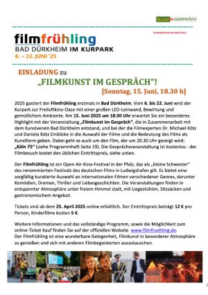 Der Kunstverein Bad Dürkheim lädt herzlich ein zu „FILMKUNST IM GESPRÄCH" in den Kurpark nach Bad Dürkheim zu kommen!